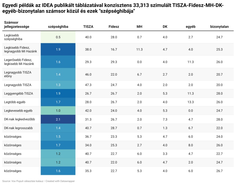 Egyéb, az IDEA táblájával összhangot mutató eredményekből viszont nagy a választék. Az alábbi táblázat ízelítőt ad a legextrémebb számsorokból, majd a tábla alján öt teljesen véletlenszerűen kiválasztott „közönséges” esetet mutat be (az ábrát megnyithatja egy külön ablakban is, ahol jobban olvasható). Utóbbiakból látszik, hogy jellemző eredmény, miszerint tíznél is több százalékkal vezet a TISZA a Fidesz előtt. Ráadásul az adatsorok szépséghibája is nagyjából úgy csökken, ahogy a kisebb TISZA-t mutató számsoroktól a nagyobb TISZA-t jelző sorozatok felé haladunk (fentebb az ábrában a lila rózsaszínesebb árnyalatai nagyobb, a kékesebbek pedig egyre kisebb „szépséghibát” jeleznek). Mivel itt az összes megkérdezett közötti eredményről van szó, ez várható mandátumarányokban kétharmados TISZA többséget ígér – de erről majd később.