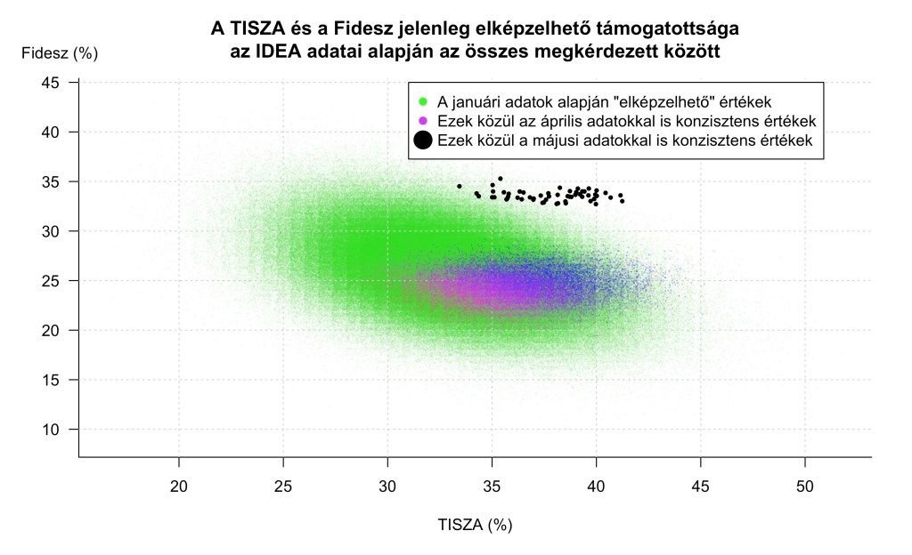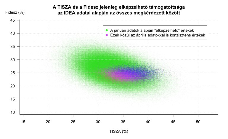 Az alábbi ábra egyrészt ugyanazokat a zöld pöttyöket mutatja, mint a megelőző. Másrészt viszont a lila különböző árnyalataival jelöli azokat a számpárokat a TISZA-Fidesz támogatottság tekintetében, amelyek a fenti meghatározásnak megfelelően összhangban vannak az IDEA által már publikált áprilisi számokkal. Jó sokféle számsor produkál ilyen, számszakilag elfogadható „megfejtést”, de olyan egy sincs köztük, amelyikben a Fidesz vezetne. Pedig az ábrán zölddel jelölt egymillió pötty között még 12% ilyen volt, további 2,3%-ban pedig pont egálban állt a TISZA és a Fidesz. Az IDEA publikált táblázatával konzisztens 33 ezer lila pötty között viszont csak öt (0.01%) van, amelyikben legalább fej-fej melletti az állás.