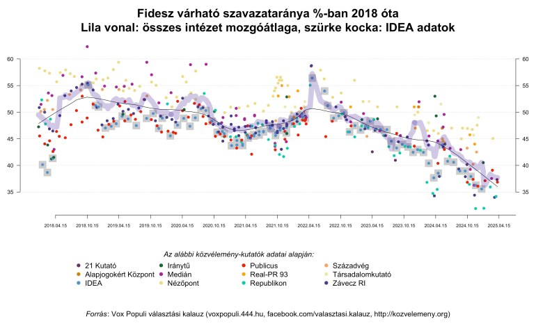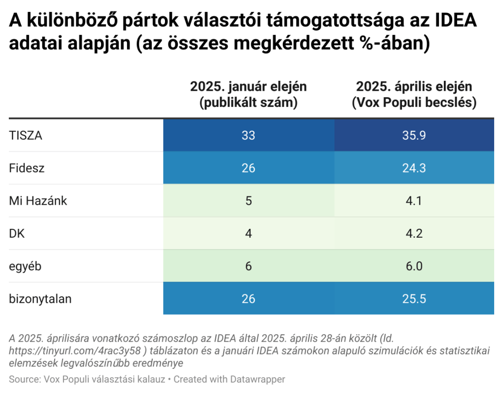 Vajon miért nem közli január óta az IDEA Intézet havonta megismételt pártpreferencia-kutatásának adatait? Annak ellenére, hogy eddig – minimális kivétellel – 2018 augusztusa óta minden hónapban megtette ezt, és 2025-ben is metronóm pontossággal ugyanazzal a módszertannal és minden hónap ugyanabban a szakaszában elvégezték magát a kutatást. Erre a kérdésre nem kaptam választ az IDEA Intézettől. Azt tudom elképzelni, hogy a másoknál látottnál nagyobb TISZA vezetést mutató adataik miatt kételkedni kezdtek adataik helyességében, és ezért inkább nem osztják meg őket. A közvélemény-kutatások világában ez az angolul „herding”-nek (nyájszellemnek) nevezett viselkedés meglehetősen jól ismert, ennél durvább formában is, amikor szimplán belenyúlnak a számokba, és tavaly ősszel elég szépen ki is mutatták a birkaszellem hatását az amerikai elnökválasztási kutatásokra.