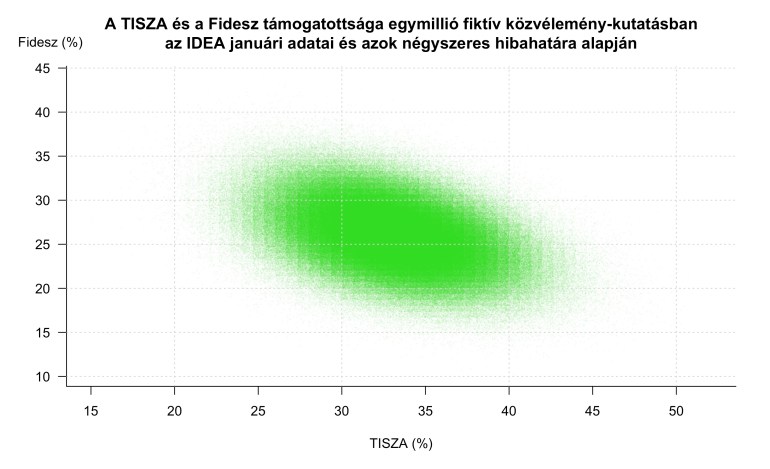 A fenti ábrában egy-egy apró zöld pettyecske mutatja, hogy az egymillió fiktív mintámban milyen kombinációi fordultak elő a Fidesz és a TISZA támogatottságának. A vízszintes és függőleges tengelyen olvashatják le, hogy a minták zömében úgy 26 és 40 százalék közé esik a TISZA, és túlnyomórészt a 20-32% sávba a Fidesz támogatottsága. Tehát a háromszoros hibahatárnak köszönhetően a lehetséges számkombinációk igen tág körét fogom tesztelni a januárban megfigyelt 33:26 versenyállás környezetében, hogy vajon melyik mutatja az utat az áprilisi valóságba.