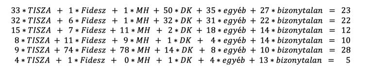 Azért értékes elszólás a fenti tábla, mert hat (vagy bármennyi) ismeretlen számot gond nélkül ki lehet számítani egy laptopon, ha ugyanannyi egymástól független egyenletben is megjelennek. Ne gondoljanak egy számtanból bukásra álló gyerekeket riogató feladatra. Megoldható a dolog Excelben egy kis klikk-klikkel, vagy a közkedvelt ChatGPT alkalmazás megkérdezésével. Itt pedig pont egy ilyen egyenletrendszer jelenik meg a fenti ábrában, amit valahogy így írhatnánk le egyenletekben (a hat dőlt betűvel kiírt szó jelenti a hat ismeretlen számot, tehát az MH például a szavazói preferenciájaként a Mi Hazánkat megnevezők arányát a mintában):